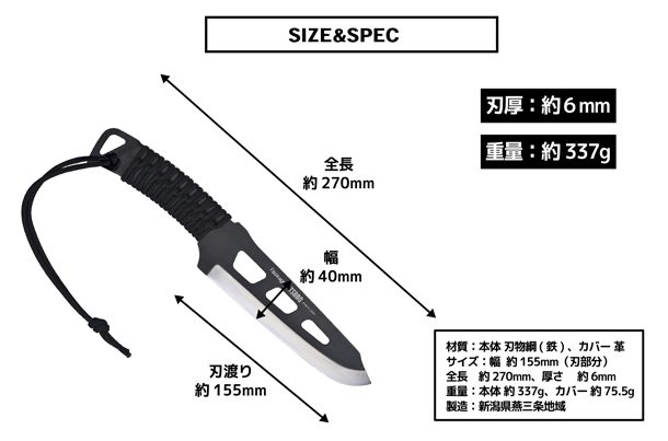 Size : Width 40mm (Blade) / Length 270mm / Thickness 6mm / Weight Body 337g, Leather case 76g