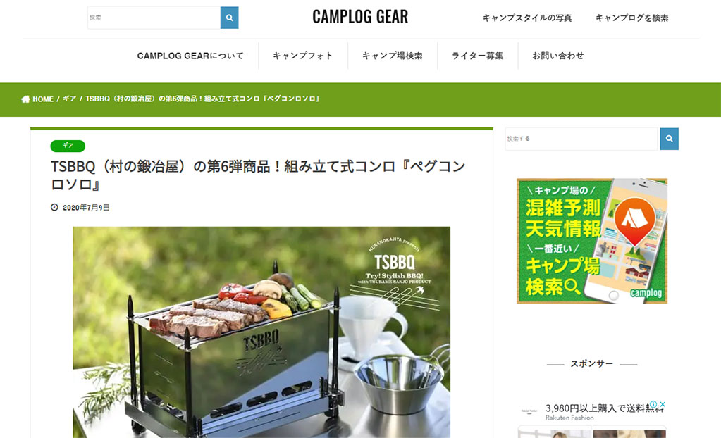 「快適なキャンプ」をコンセプトに展開するWEBメディア『CAMPLOG GEAR』にTSBBQ?ペグコンロソロが掲載されました。